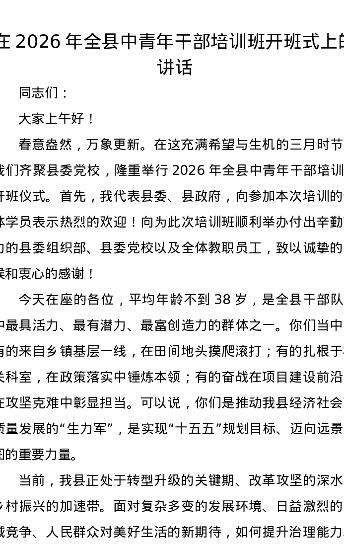 在2026年全县中青年干部培训班开班式上的讲话