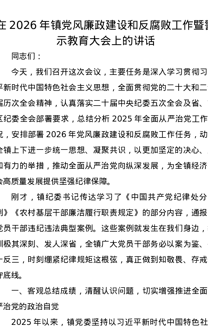 在2026年镇党风廉政建设和反腐败工作暨警示教育大会上的讲话