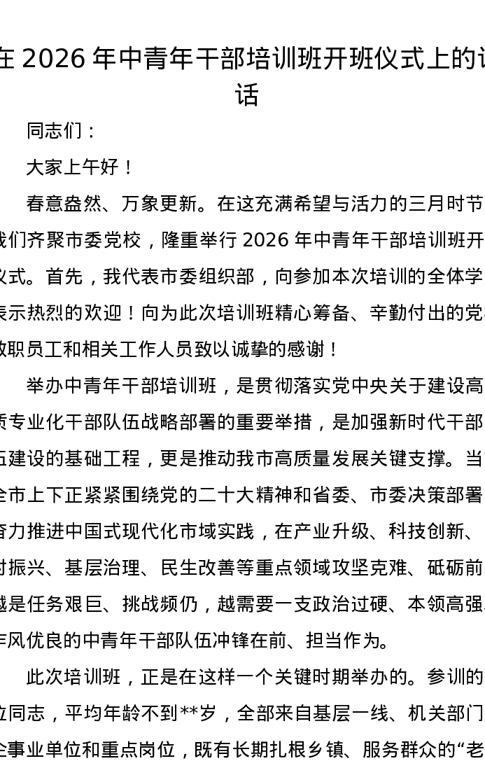 在2026年中青年干部培训班开班仪式上的讲话