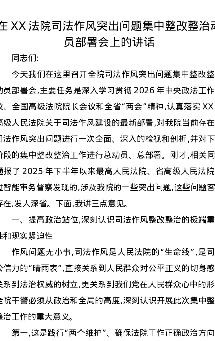 在XX法院司法作风突出问题集中整改整治动员部署会上的讲话