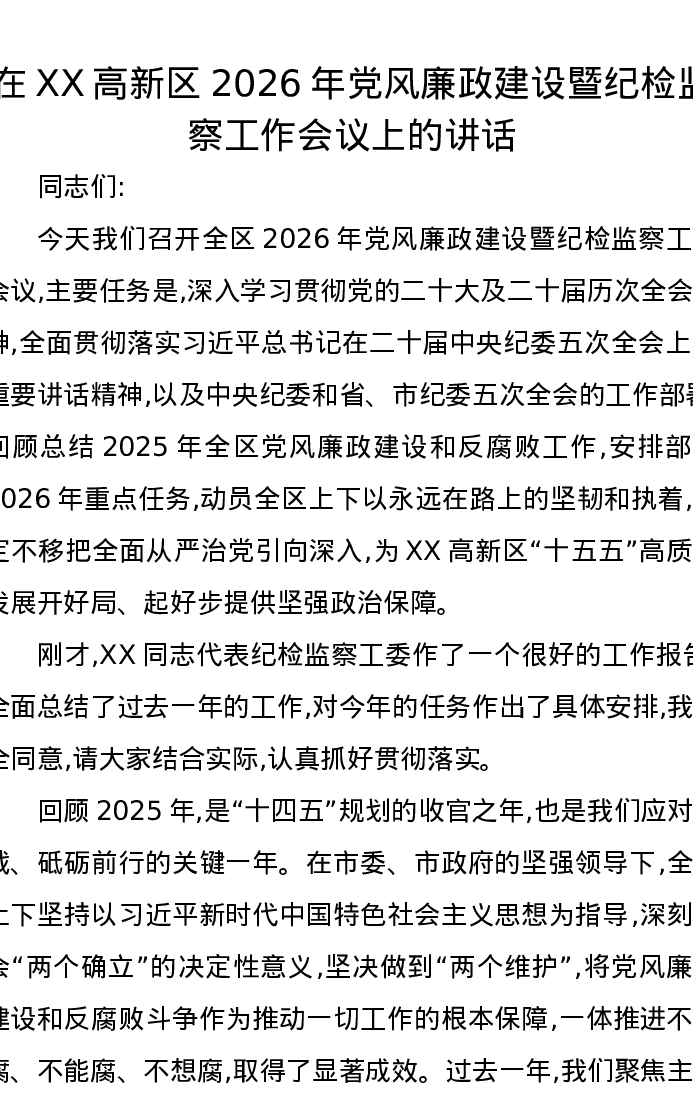 在XX高新区2026年党风廉政建设暨纪检监察工作会议上的讲话