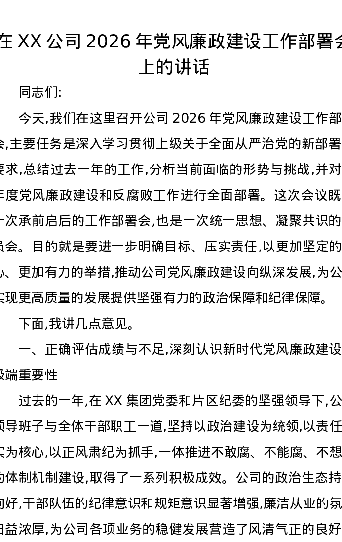 在XX公司2026年党风廉政建设工作部署会上的讲话