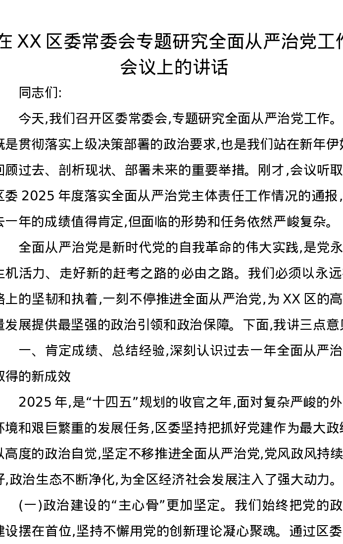 在XX区委常委会专题研究全面从严治党工作会议上的讲话