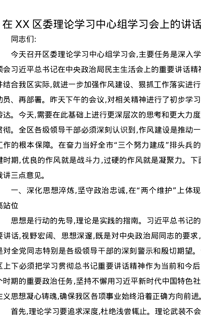 在XX区委理论学习中心组学习会上的讲话