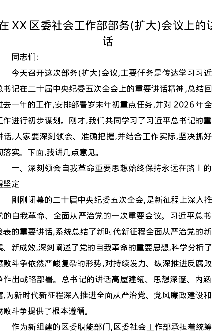 在XX区委社会工作部部务(扩大)会议上的讲话