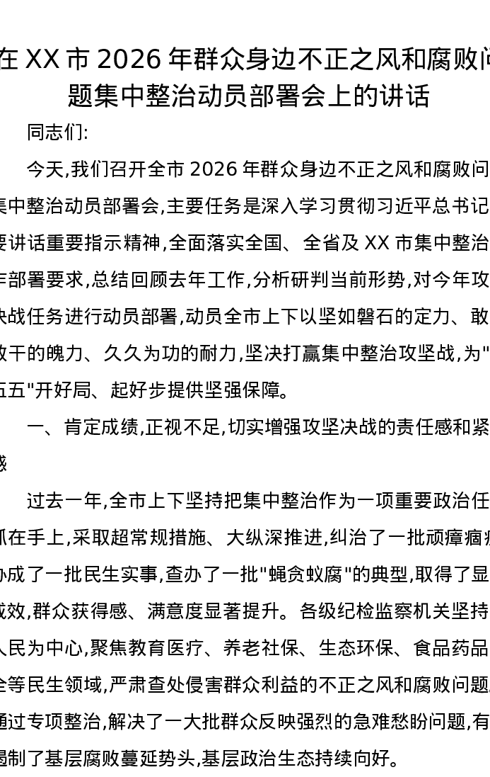 在XX市2026年群众身边不正之风和腐败问题集中整治动员部署会上的讲话