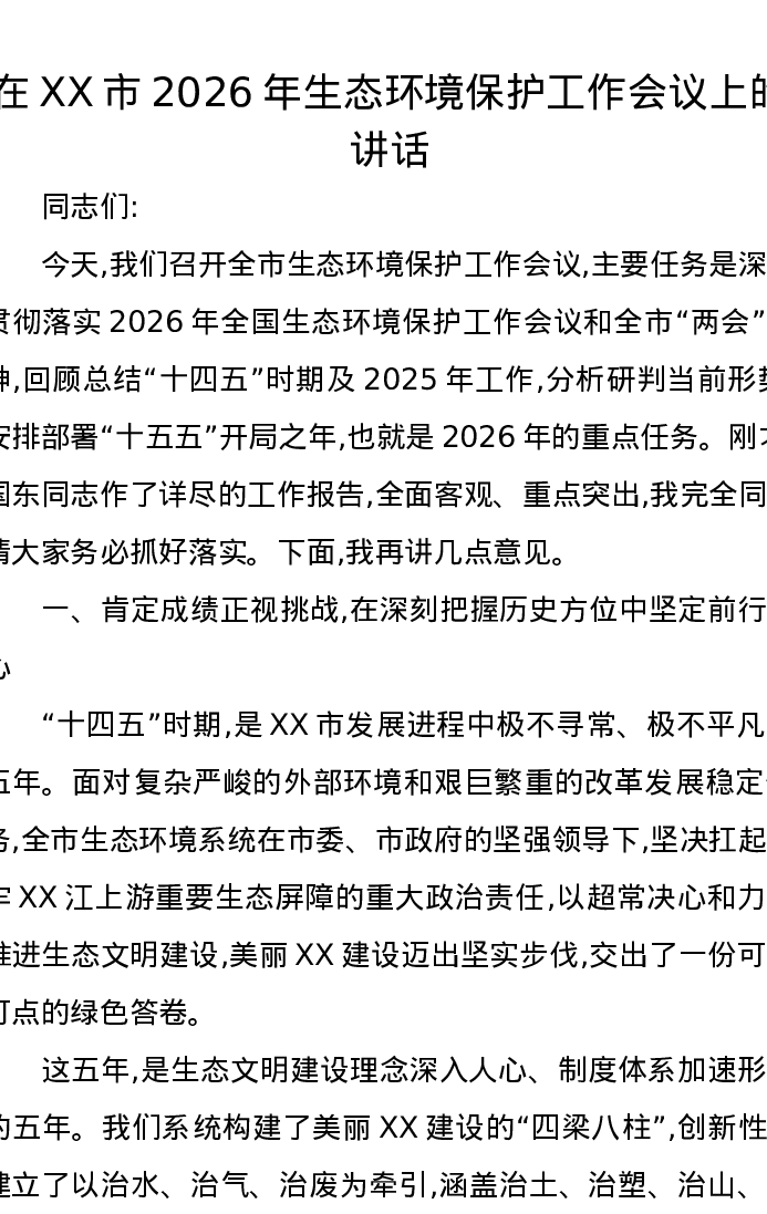 在XX市2026年生态环境保护工作会议上的讲话