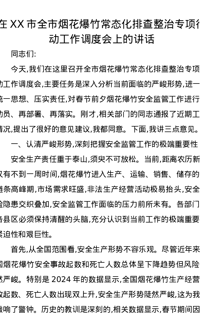 在XX市全市烟花爆竹常态化排查整治专项行动工作调度会上的讲话