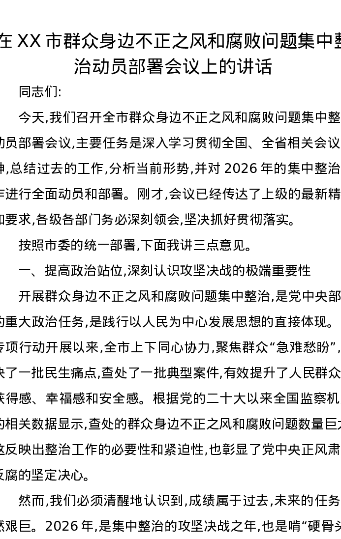 在XX市群众身边不正之风和腐败问题集中整治动员部署会议上的讲话
