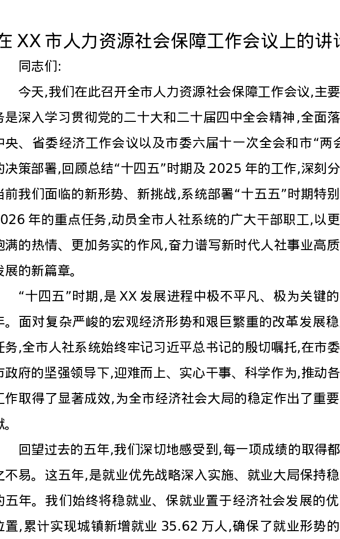 在XX市人力资源社会保障工作会议上的讲话