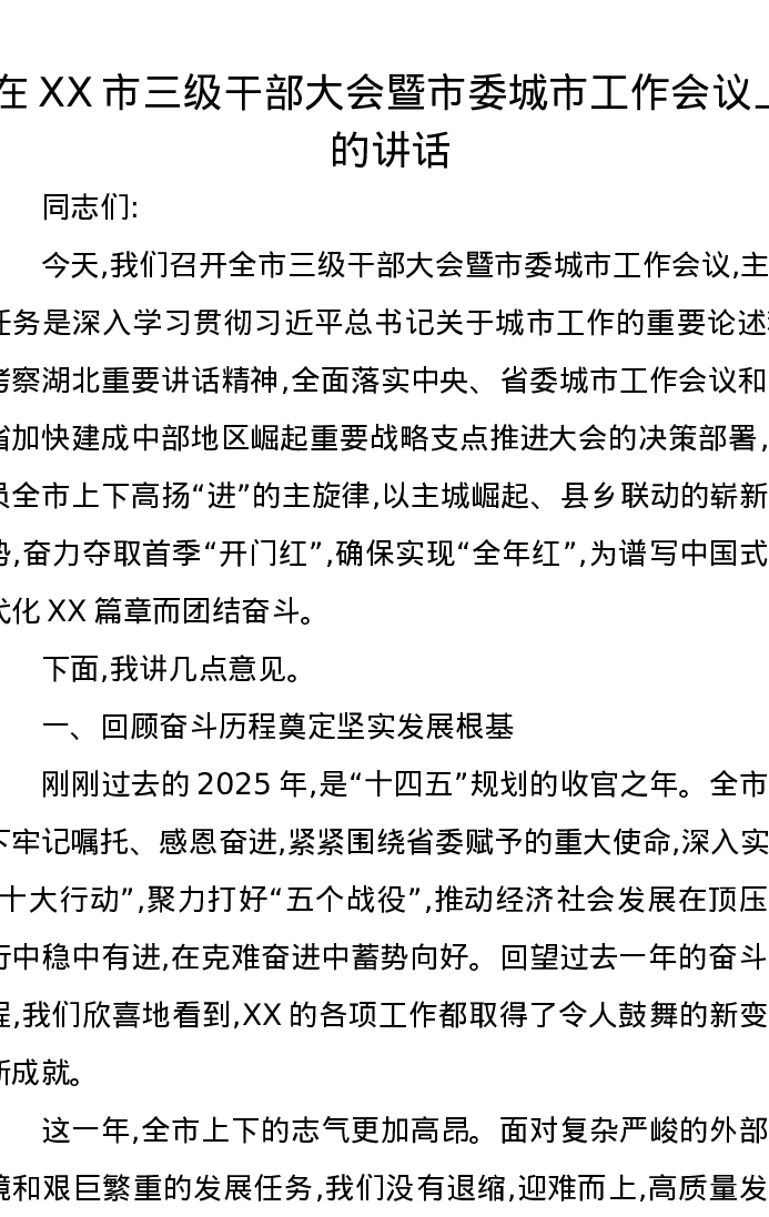 在XX市三级干部大会暨市委城市工作会议上的讲话