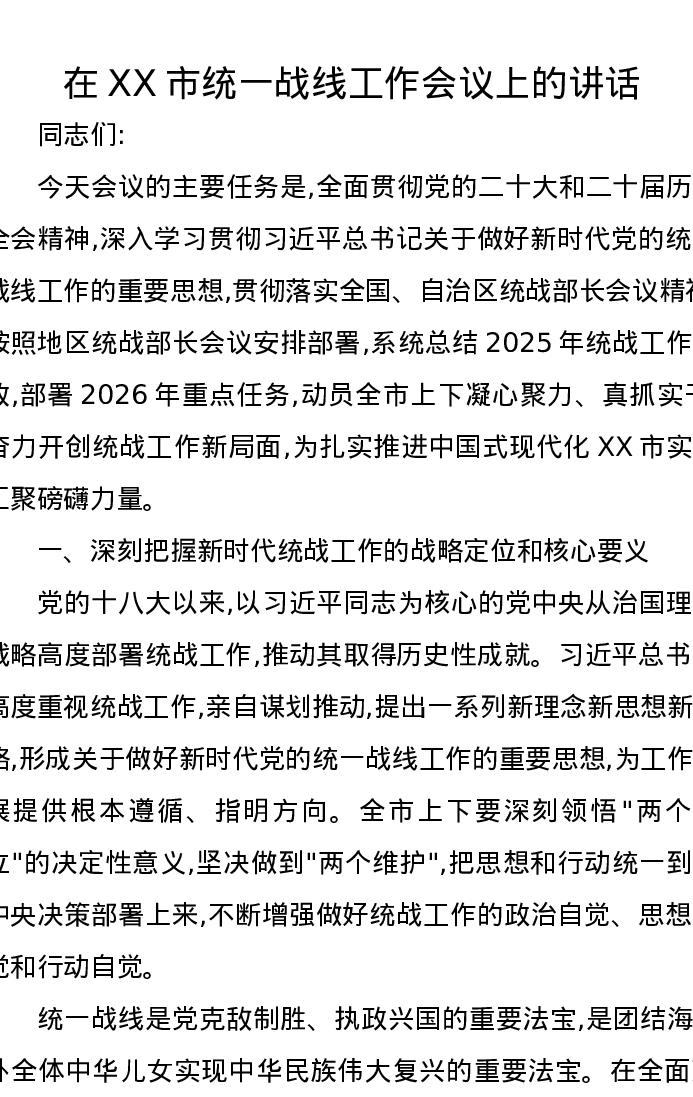 在XX市统一战线工作会议上的讲话