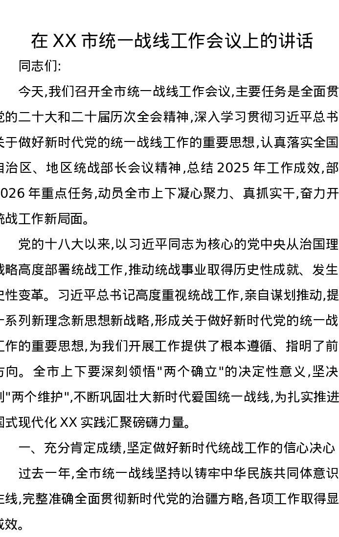 在XX市统一战线工作会议上的讲话1