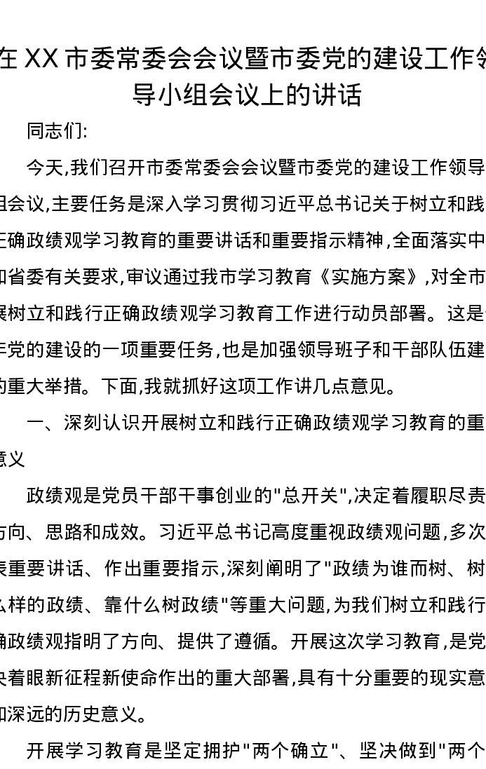 在XX市委常委会会议暨市委党的建设工作领导小组会议上的讲话