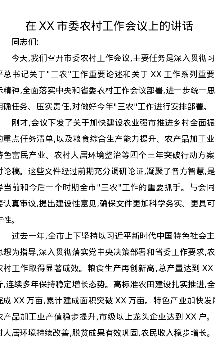 在XX市委农村工作会议上的讲话3