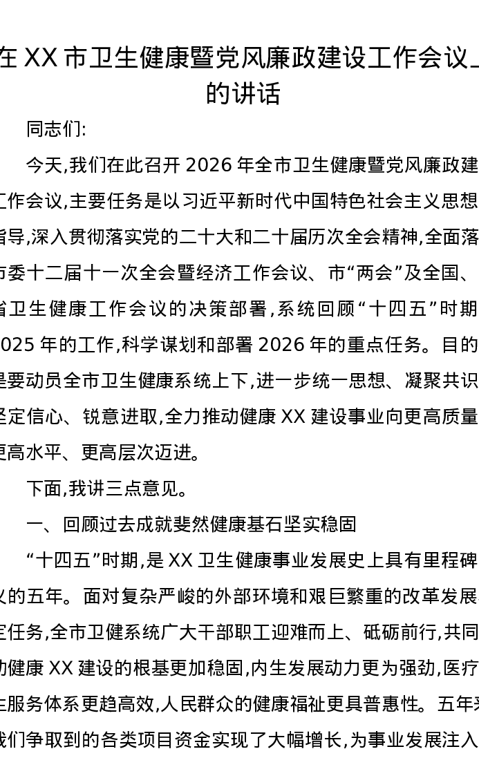 在XX市卫生健康暨党风廉政建设工作会议上的讲话