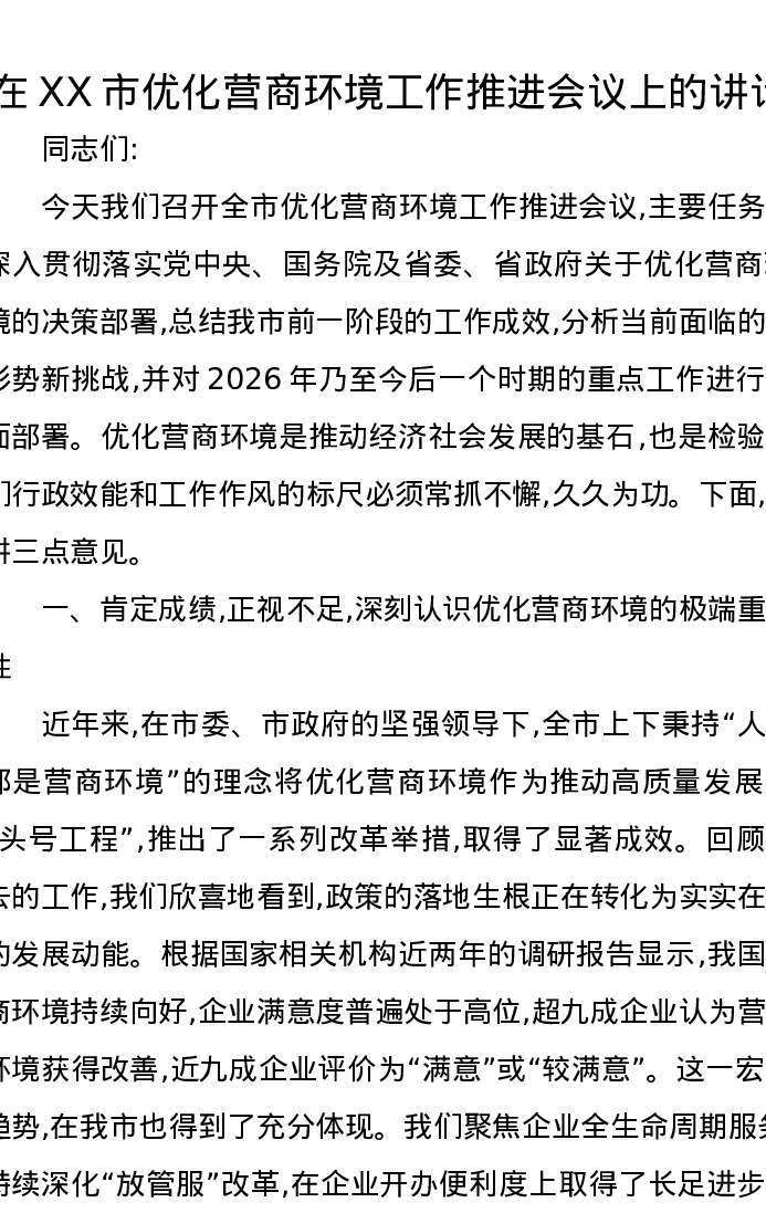 在XX市优化营商环境工作推进会议上的讲话2