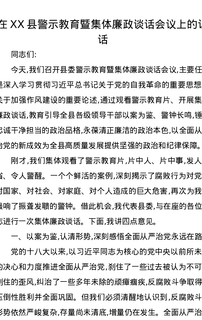 在XX县警示教育暨集体廉政谈话会议上的讲话