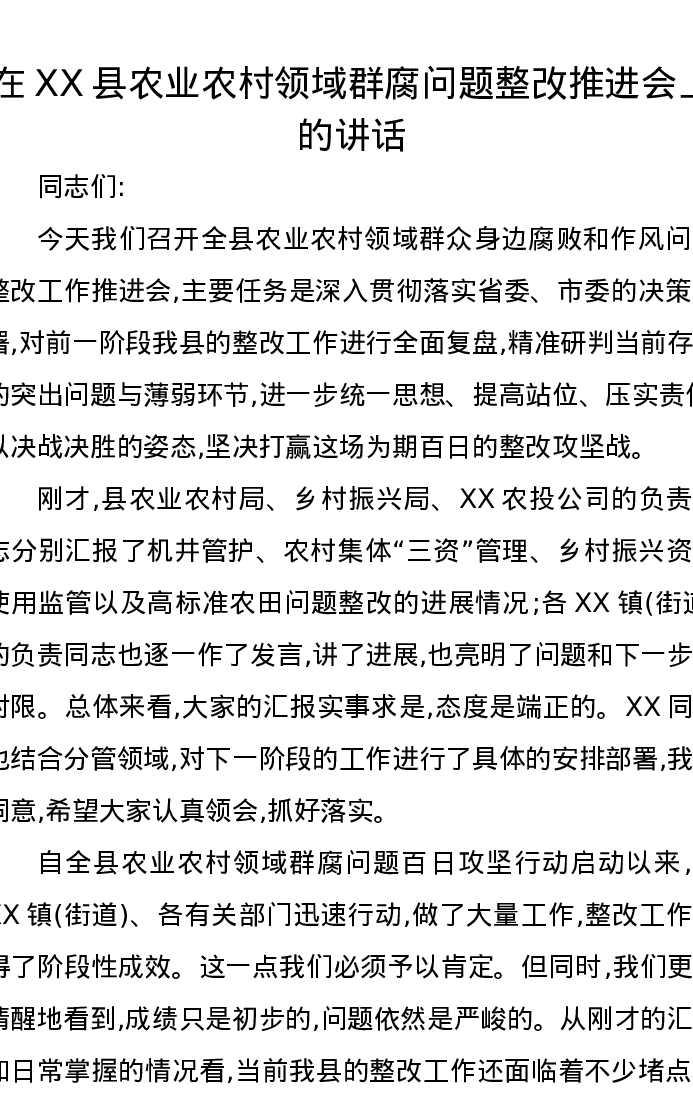 在XX县农业农村领域群腐问题整改推进会上的讲话