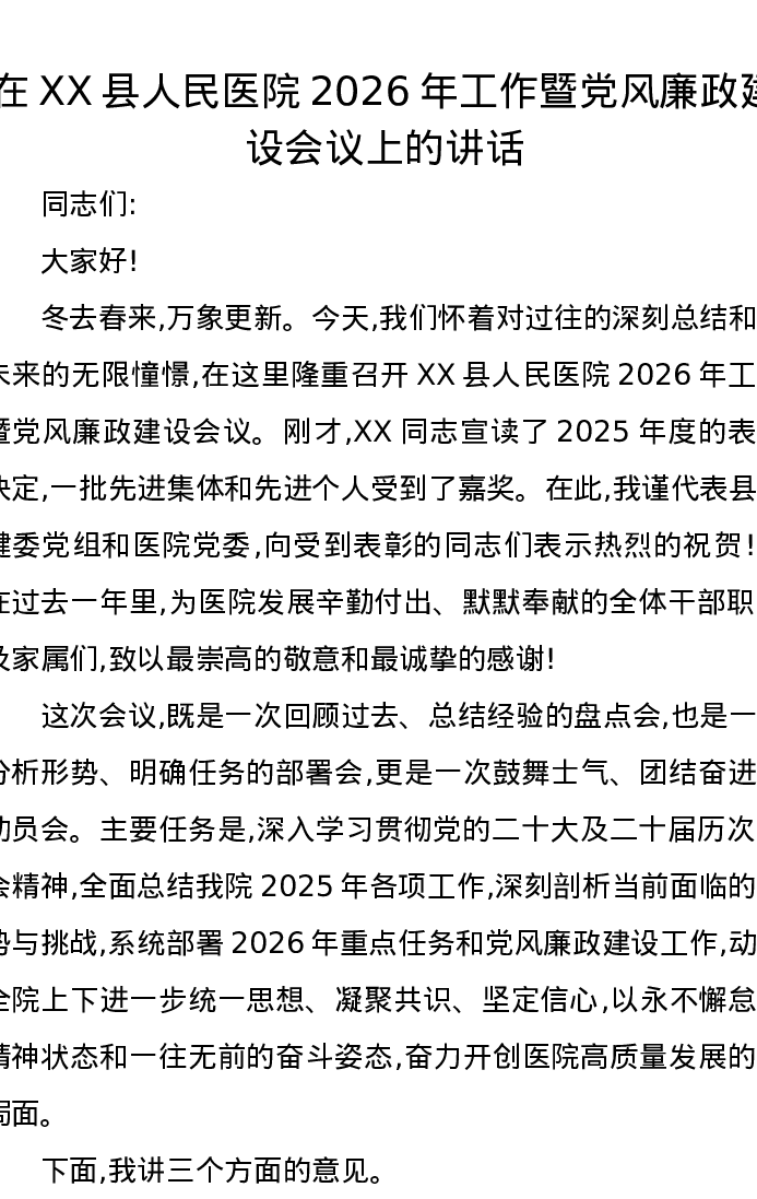 在XX县人民医院2026年工作暨党风廉政建设会议上的讲话