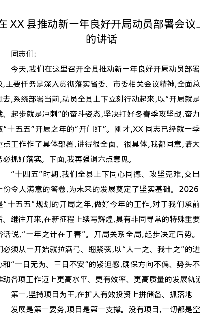 在XX县推动新一年良好开局动员部署会议上的讲话