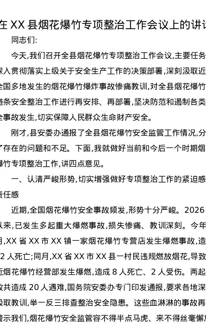 在XX县烟花爆竹专项整治工作会议上的讲话