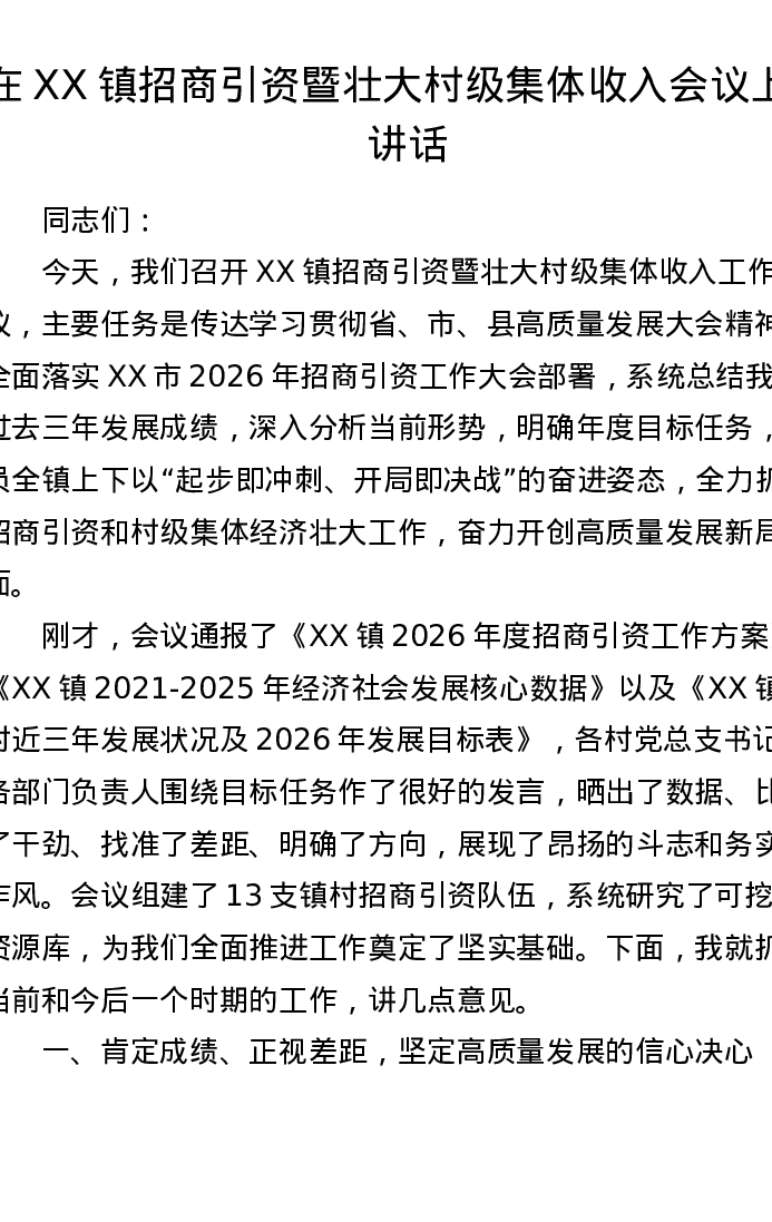在XX镇招商引资暨壮大村级集体收入会议上的讲话