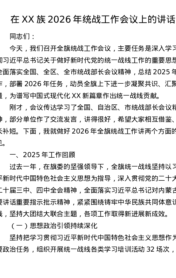 在XX族2026年统战工作会议上的讲话