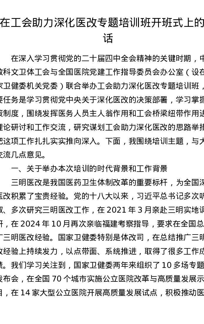 在工会助力深化医改专题培训班开班式上的讲话