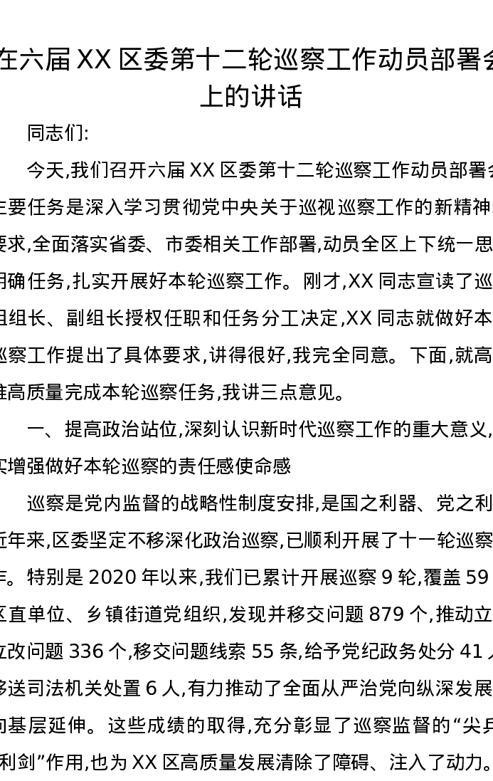 在六届XX区委第十二轮巡察工作动员部署会上的讲话