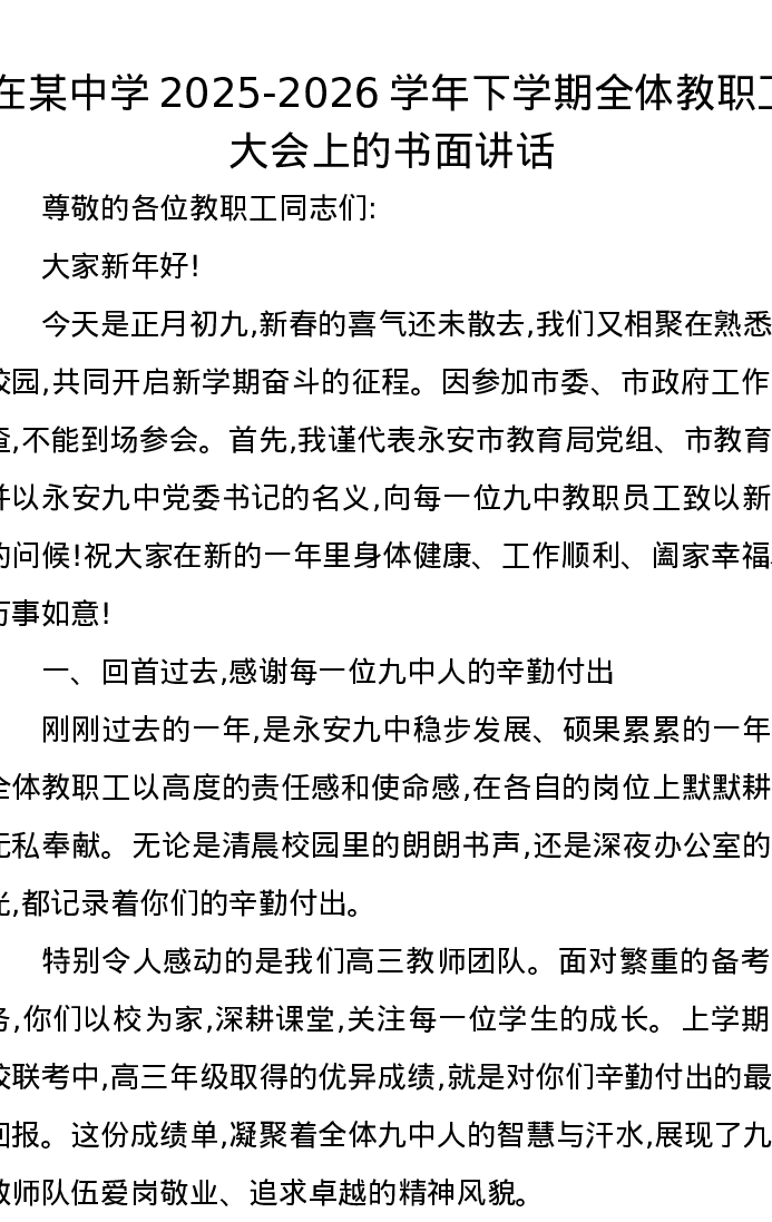在某中学2025-2026学年下学期全体教职工大会上的书面讲话