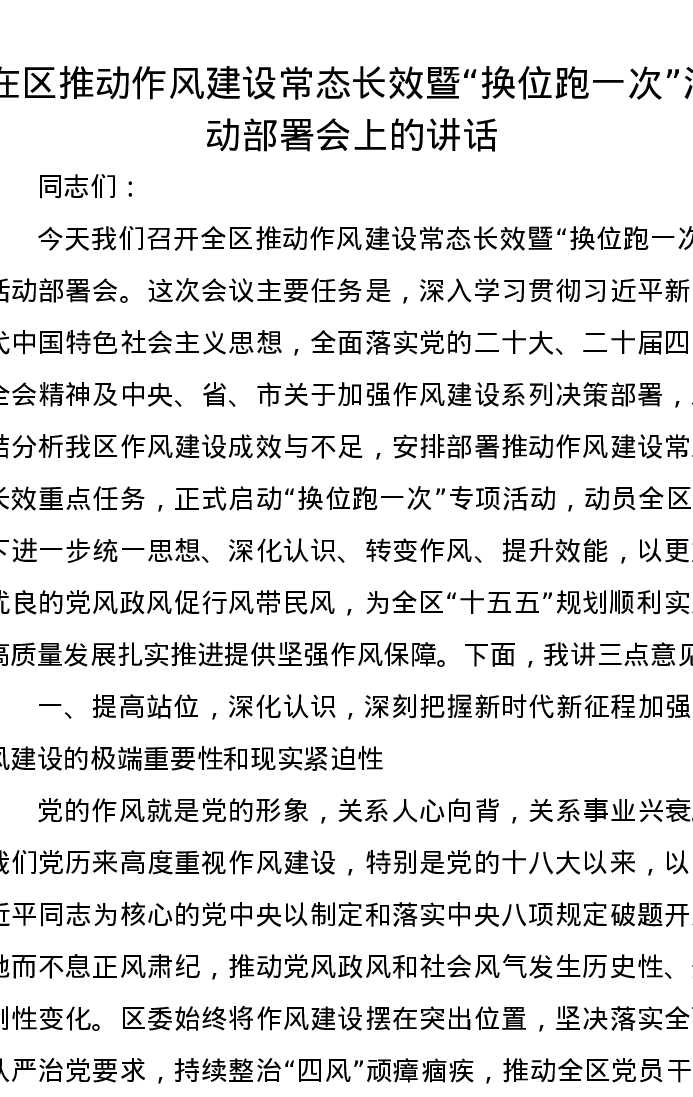在区推动作风建设常态长效暨换位跑一次活动部署会上的讲话