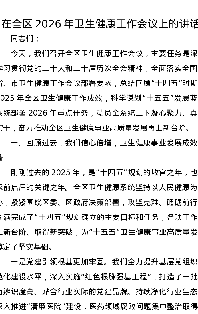 在全区2026年卫生健康工作会议上的讲话
