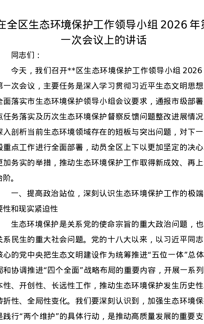 在全区生态环境保护工作领导小组2026年第一次会议上的讲话
