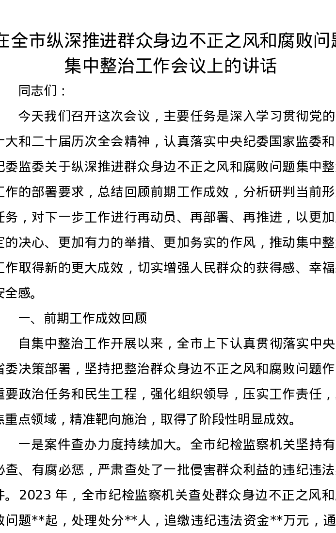 在全市纵深推进群众身边不正之风和腐败问题集中整治工作会议上的讲话