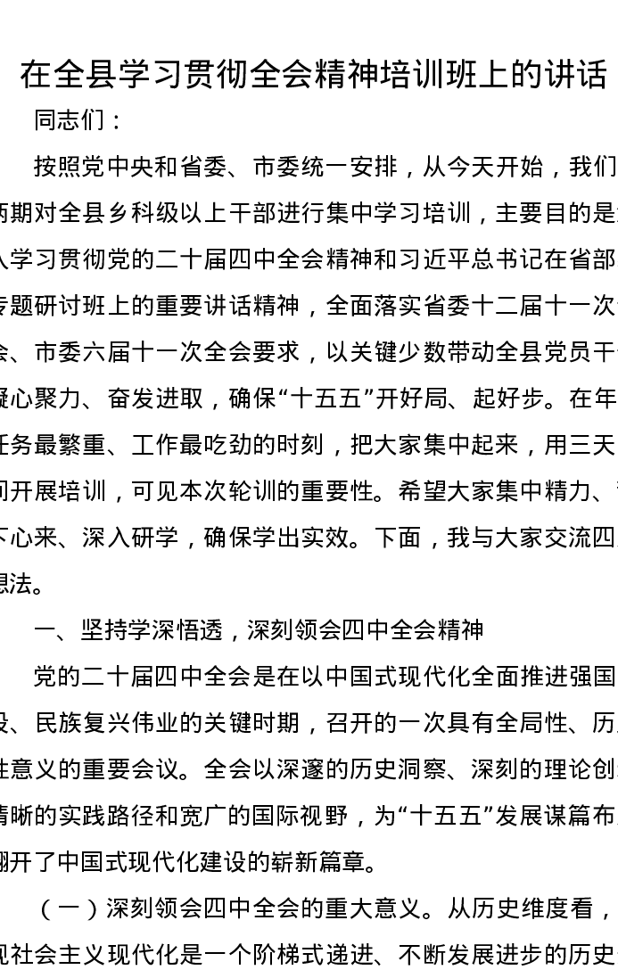 在全县学习贯彻全会精神培训班上的讲话