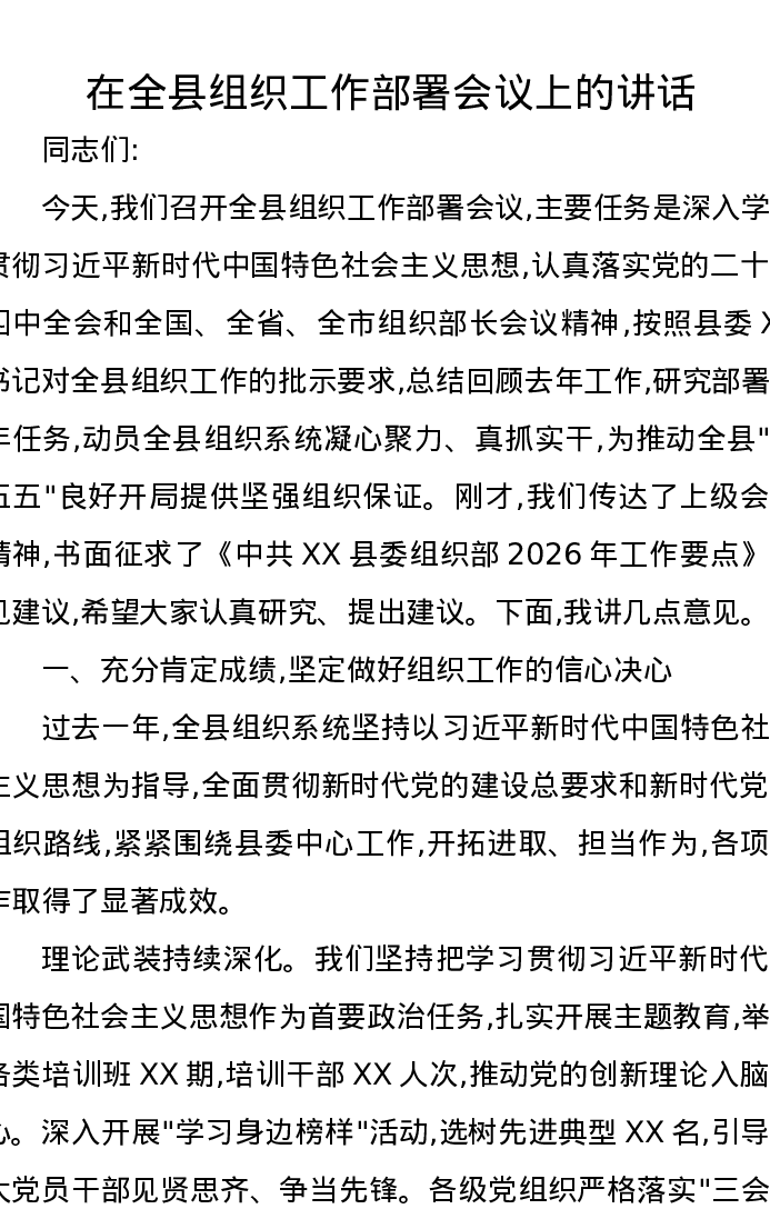 在全县组织工作部署会议上的讲话