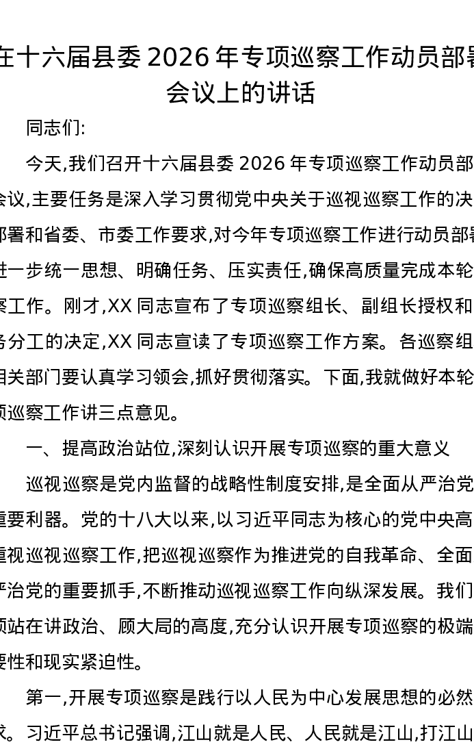 在十六届县委2026年专项巡察工作动员部署会议上的讲话