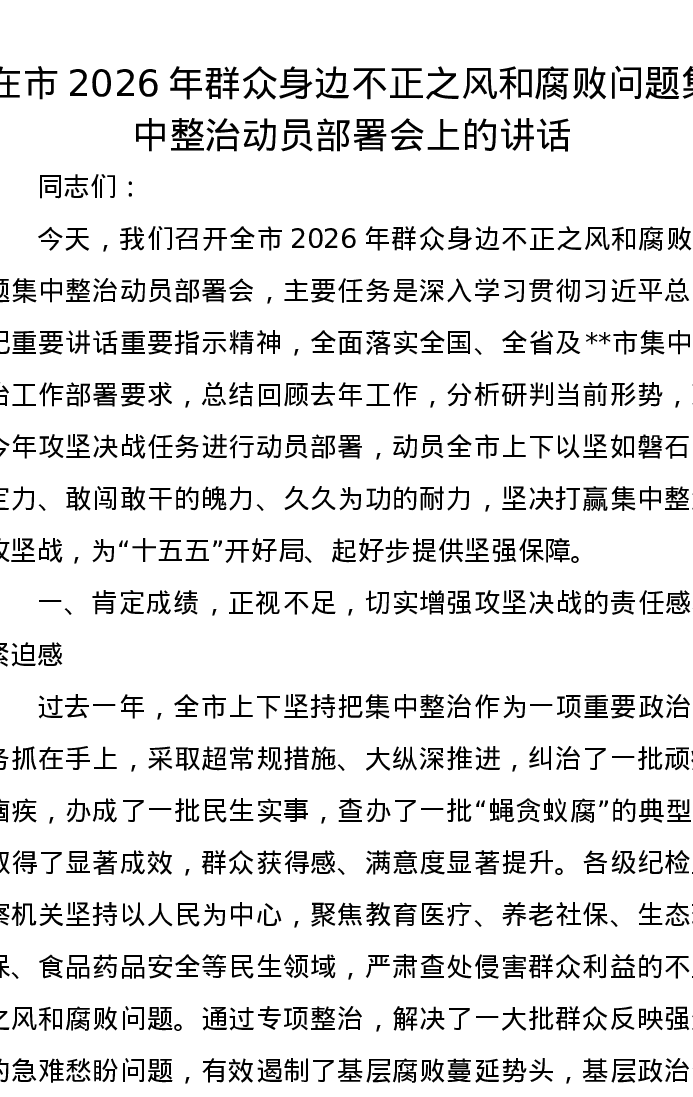在市2026年群众身边不正之风和腐败问题集中整治动员部署会上的讲话
