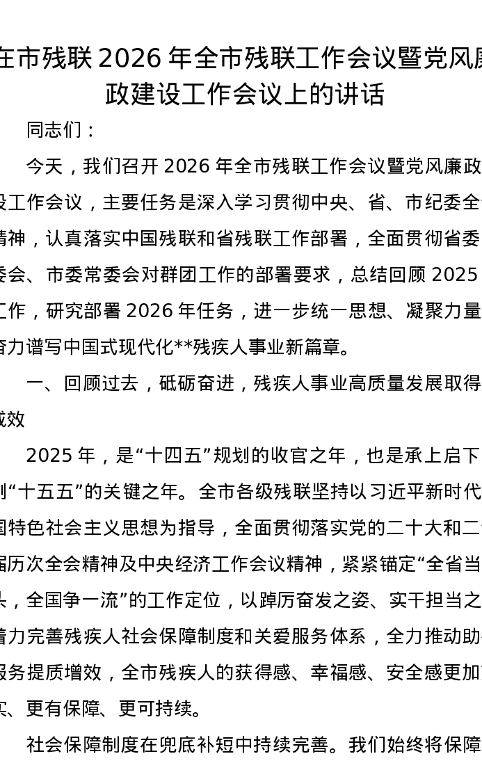 在市残联2026年全市残联工作会议暨党风廉政建设工作会议上的讲话