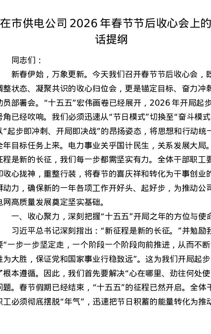 在市供电公司2026年春节节后收心会上的讲话提纲