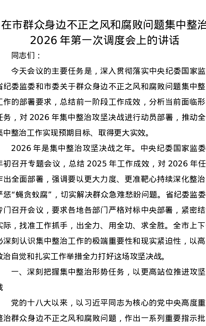 在市群众身边不正之风和腐败问题集中整治2026年第一次调度会上的讲话