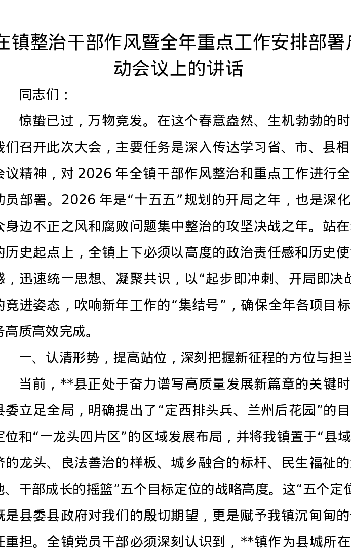 在镇整治干部作风暨全年重点工作安排部署启动会议上的讲话