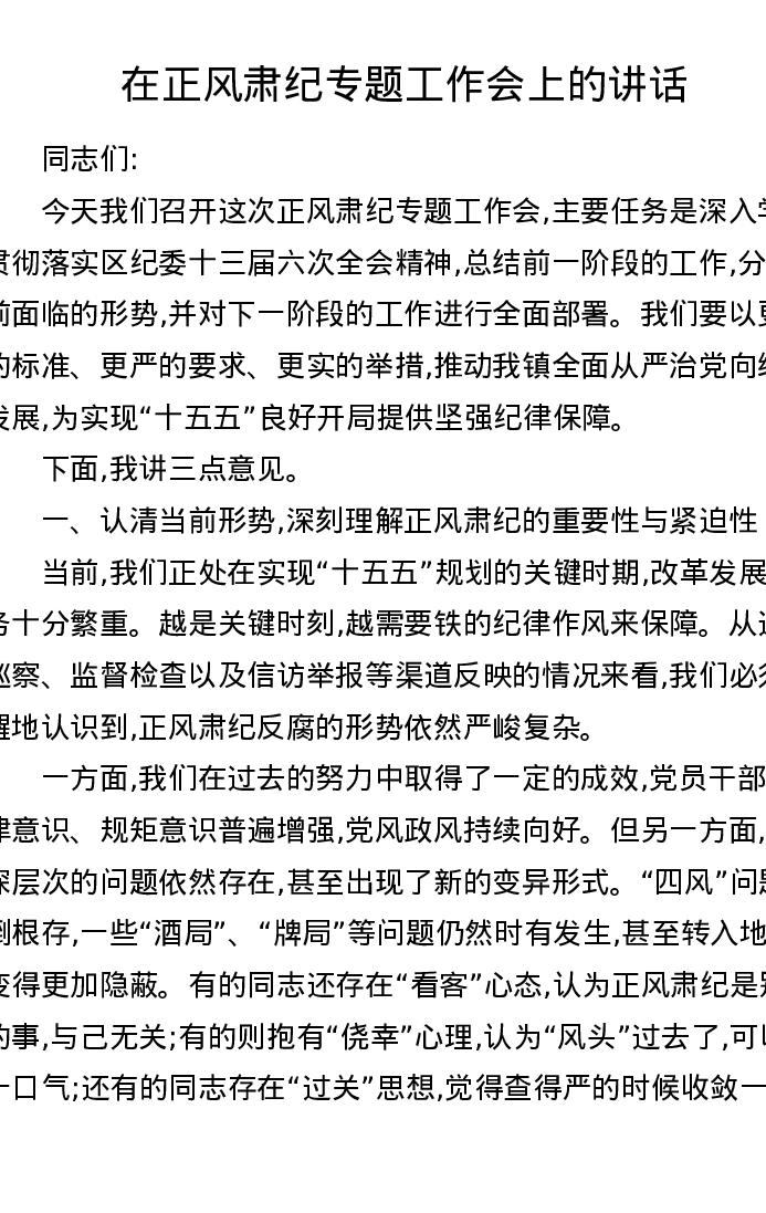 在正风肃纪专题工作会上的讲话