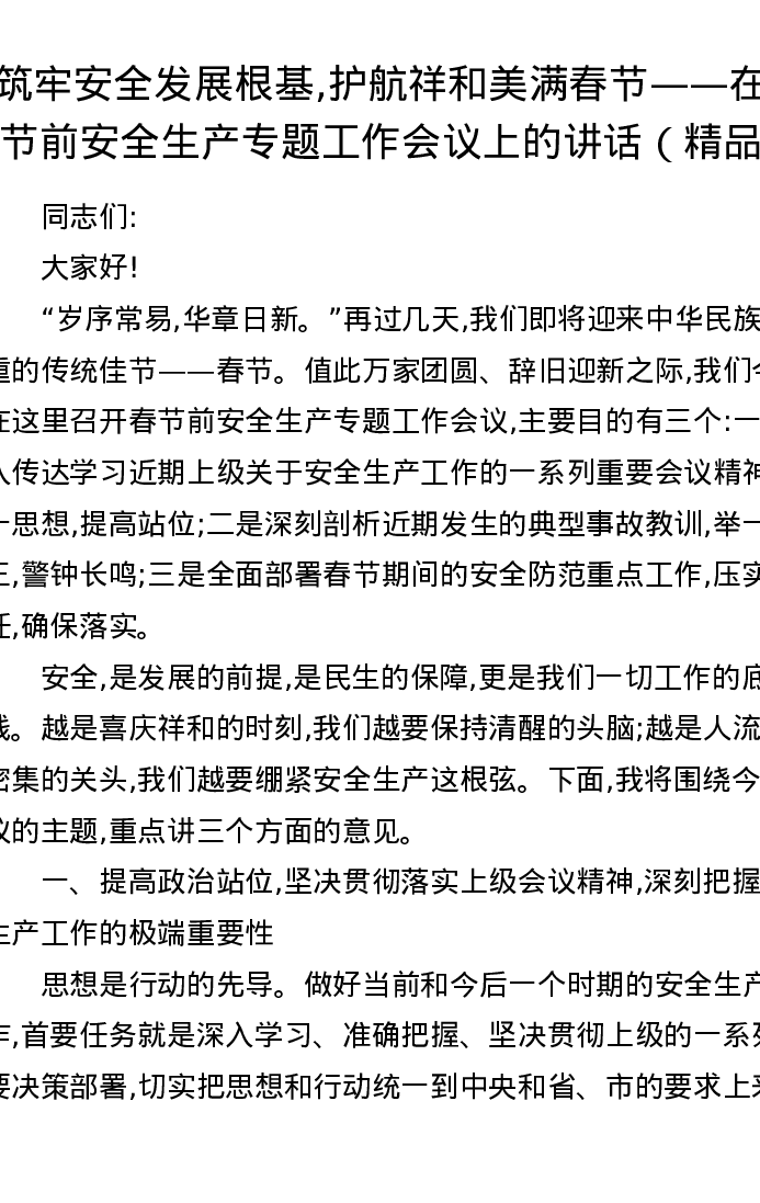 筑牢安全发展根基,护航祥和美满春节——在春节前安全生产专题工作会议上的讲话