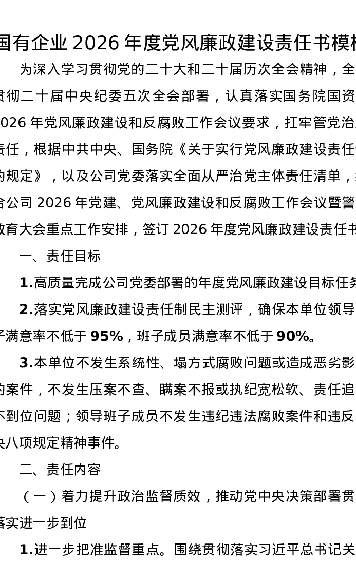 国有企业2026年度党风廉政建设责任书模板