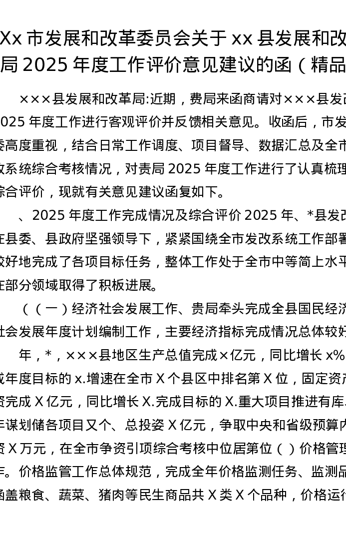 Xx市发展和改革委员会关于xx县发展和改革局2025 年度工作评价意见建议的函