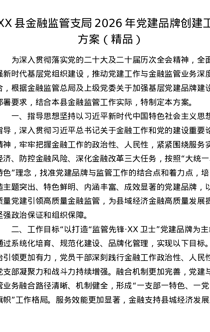 XX县金融监管支局2026年党建品牌创建工作方案