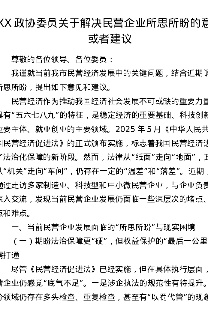 XX政协委员关于解决民营企业所思所盼的意见或者建议2