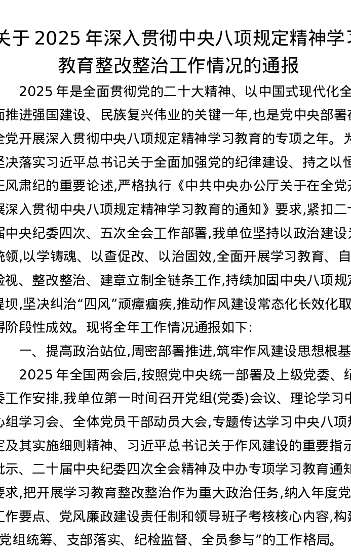 关于2025年深入贯彻中央八项规定精神学习教育整改整治工作情况的通报